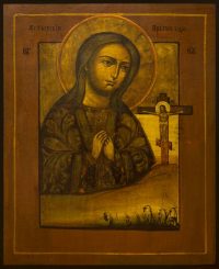 Икона отличается уникальной иконографией: на ней изображена Богородица со скрещенными на груди руками, погруженная в молитву перед распятым Христом.