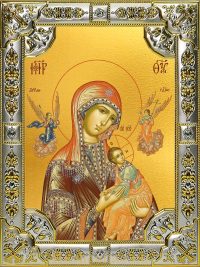 Икона в изысканном окладе, которая гармонично сочетает в себе сакральную глубину православной традиции и изящество современного исполнения. Этот образ станет настоящей жемчужиной вашего домашнего иконостаса или исключительным подарком для особо важных событий.
