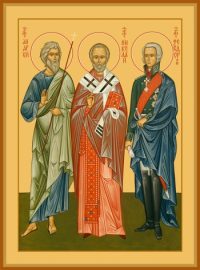 Наш православный магазин предлагает купить икону Андрей Первозванный апостол, Николай святитель, Феодор Ушаков праведный, икона (арт.06624)