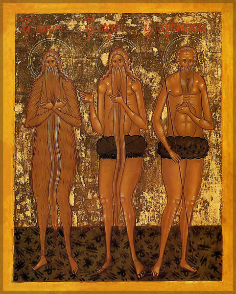 Наш православный магазин предлагает купить Преподобные Отшельники Макарий Египетский, Онуфрий Великий и Петр Афонский, икона (арт.м0348)