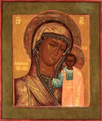 Этот чудотворный образ был обретен в Казани в 1579 году после страшного пожара по указанию самой Богородицы, явившейся во сне девятилетней девочке Матроне. Казанская икона относится к типу «Одигитрия» (Путеводительница), где Младенец Христос благословляет правой рукой, а в левой держит свиток. Перед этим образом молятся о прозрении слепых очей и исцелении других болезней, о помощи в семейных делах, о защите дома от бед и напастей, а воины — о победе и покровительстве в ратном деле.